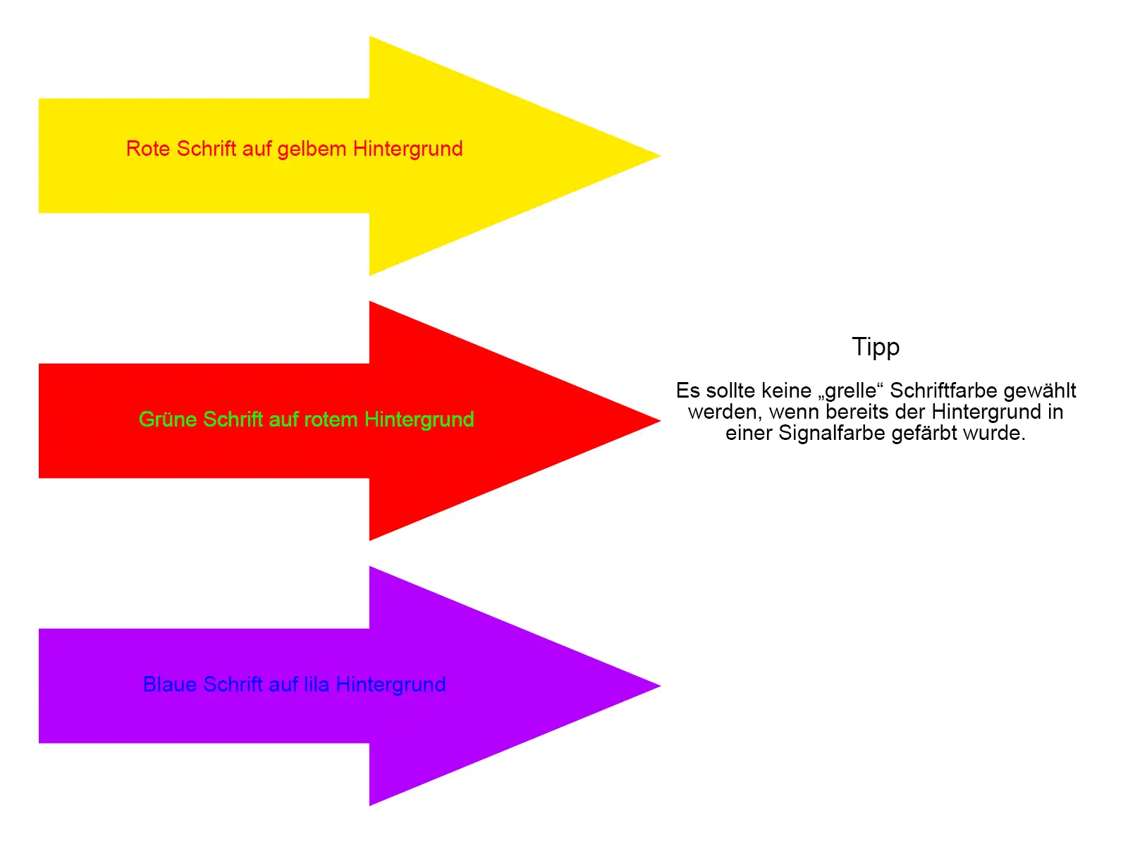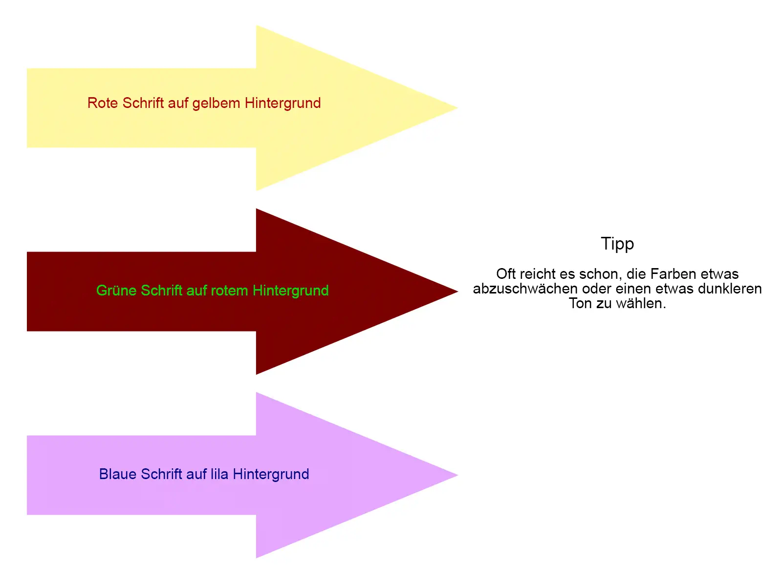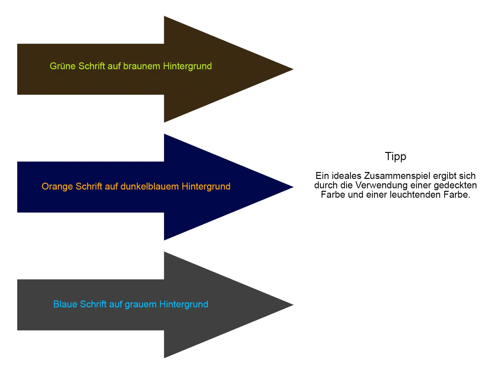 Wie schon erwähnt, ist es sehr wichtig, dass die Farben gut zu erkennen und für das menschliche Auge angenehm zu betrachten sind. Es gibt Farbkombinationen, die für das Auge so unangenehm sind, dass man gar nicht hingucken mag. Andere dagegen wirken sehr harmonisch.