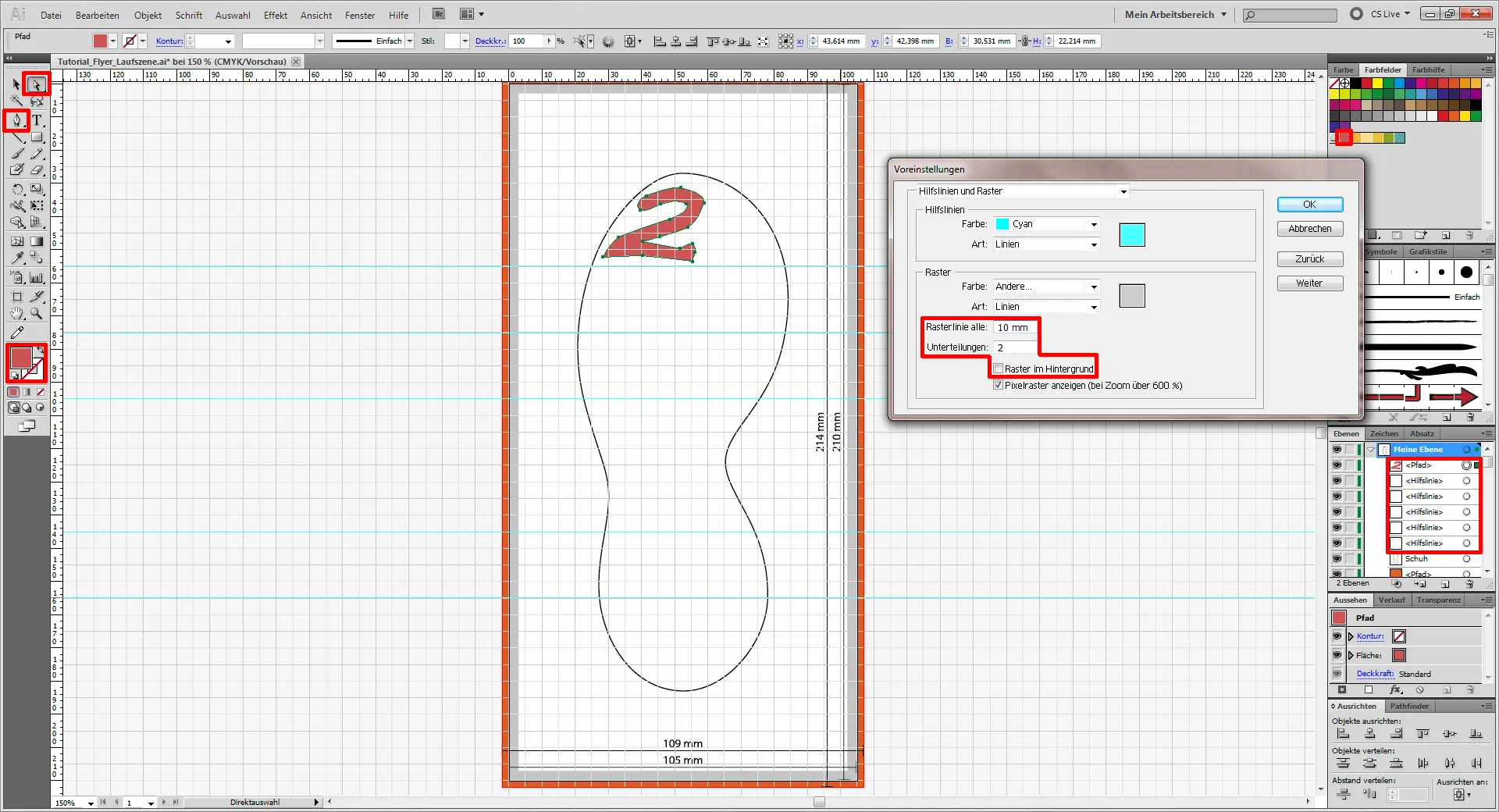 Nun müsst ihr euch ein Raster konfigurieren, um etwa die Größe eurer Buchstaben und Zahlen abschätzen zu können. Dazu geht ihr auf Bearbeiten->Voreinstellungen->Hilfslinien & Raster. Dort stellt ihr 10 mm bei „Rasterlinie alle“ und 2 bei „Unterteilungen“ ein. Dann zieht ihr euch aus der Linealleiste (Strg+R) mehrere Hilfslinien heraus. Dann beginnt ihr, mit dem Zeichenstift-Werkzeug (P) die erste Zahl in den Schuh hineinzuschreiben (Farbe #D85050). Abhängig davon, wie viele Laufveranstaltungen ihr schon gemacht habt.
