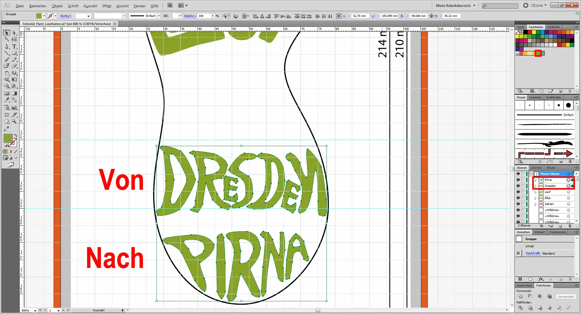 Genau so geht ihr nun bei den Buchstaben für den Namen eurer Laufveranstaltung vor. Diese verseht ihr auf dem Flyer mit einem hellen Grün (#8FA025).