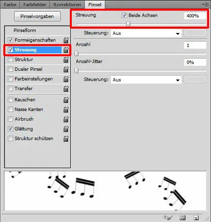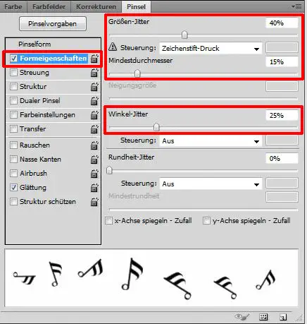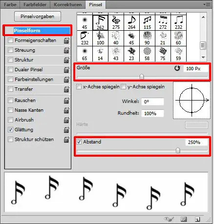 Nun rufen wir das Pinsel-Werkzeug (B) auf und öffnen im Pinsel-Fenster einen beliebigen Pinsel aus dem Noten-Pinsel-Set. Im Pinsel-Fenster nehmen wir folgende Einstellungen vor: