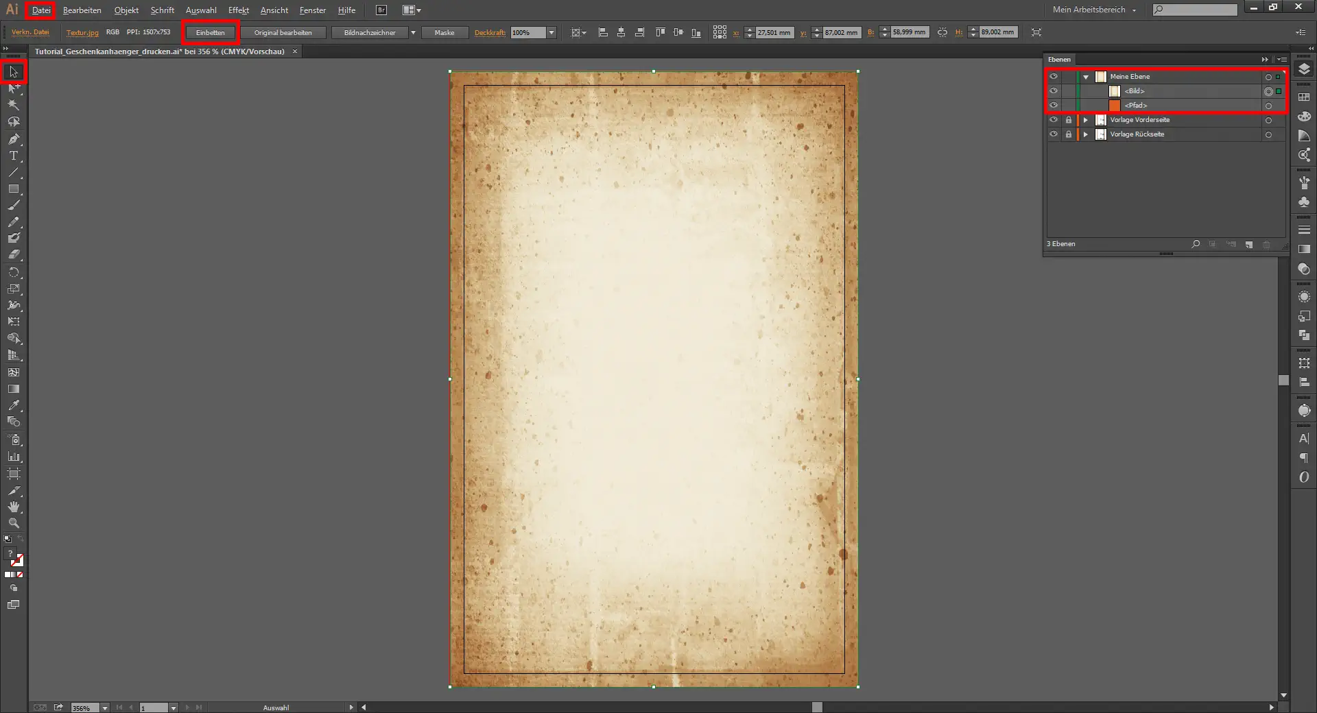 Ihr öffnet also im ersten Schritt eure Visitenkarten-Druckvorlage für diesen Geschenkanhänger in Adobe Illustrator über den Menüpunkt Datei / Öffnen oder optional mit dem Shortcut Strg + O. Dann zieht ihr euch über Datei / Platzieren eine Textur in euer Dokument. Diese Papiertextur könnt ihr euch bei sxc.hu kostenlos herunterladen (© Billy Alexander, sxc.hu). Mit dem Auswahl-Werkzeug (V) und gedrückt gehaltener Umschalt-Taste könnt ihr diese Textur drehen und auf eure Dokumentengröße anpassen. Abschließend geht ihr oben in der Steuerungsleiste auf die Schaltfläche „Einbetten“.