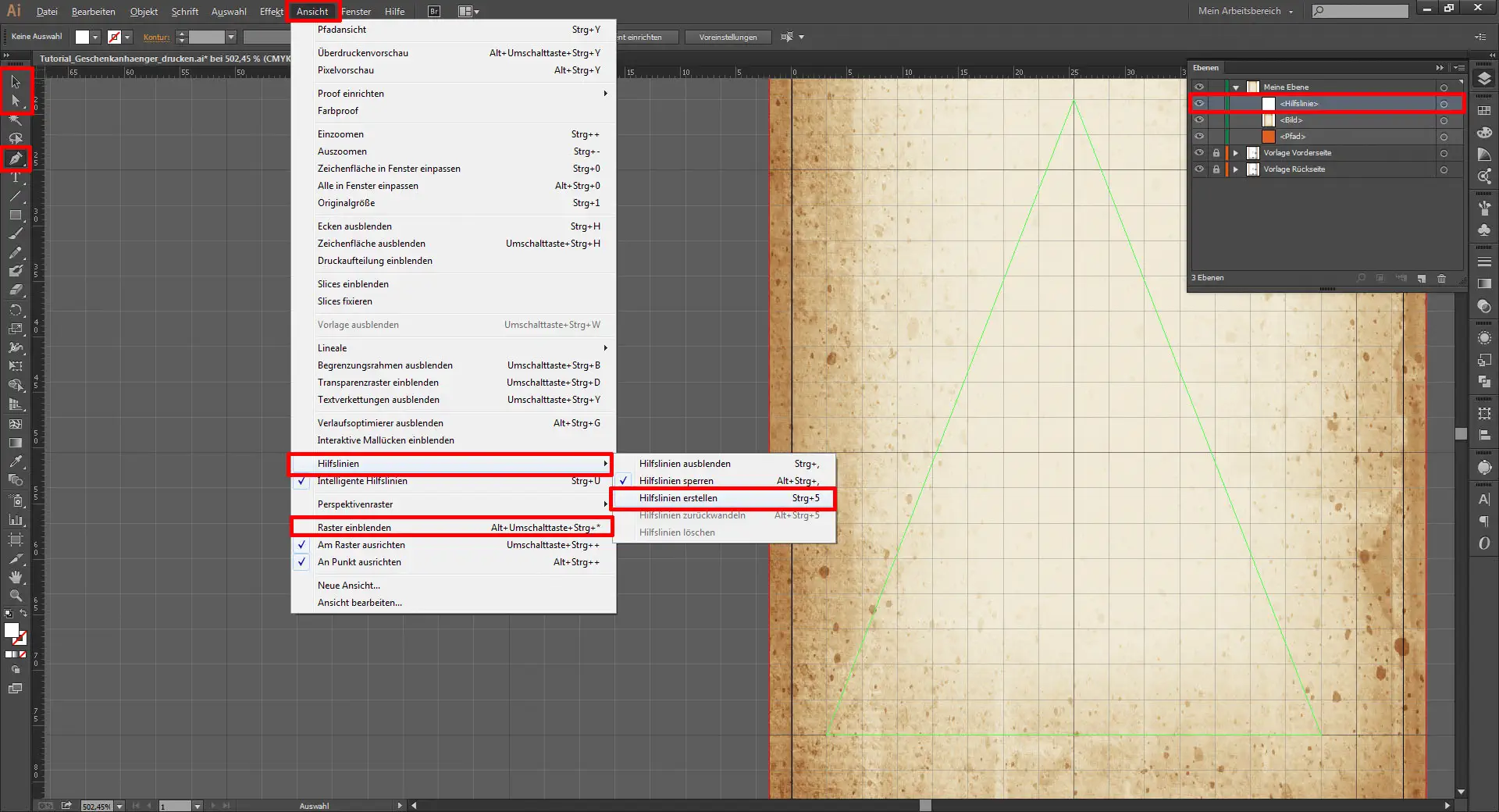 Jetzt blendet ihr euch das vorkonfigurierte Raster ein (Ansicht / Raster einblenden). Ihr zieht euch nun mit dem Zeichenstift-Werkzeug (P) ein gleichschenkliges Dreieck auf. Mit diesem markierten Dreieck geht ihr dann auf Ansicht / Hilfslinien / Hilfslinien erstellen (Strg + 5).