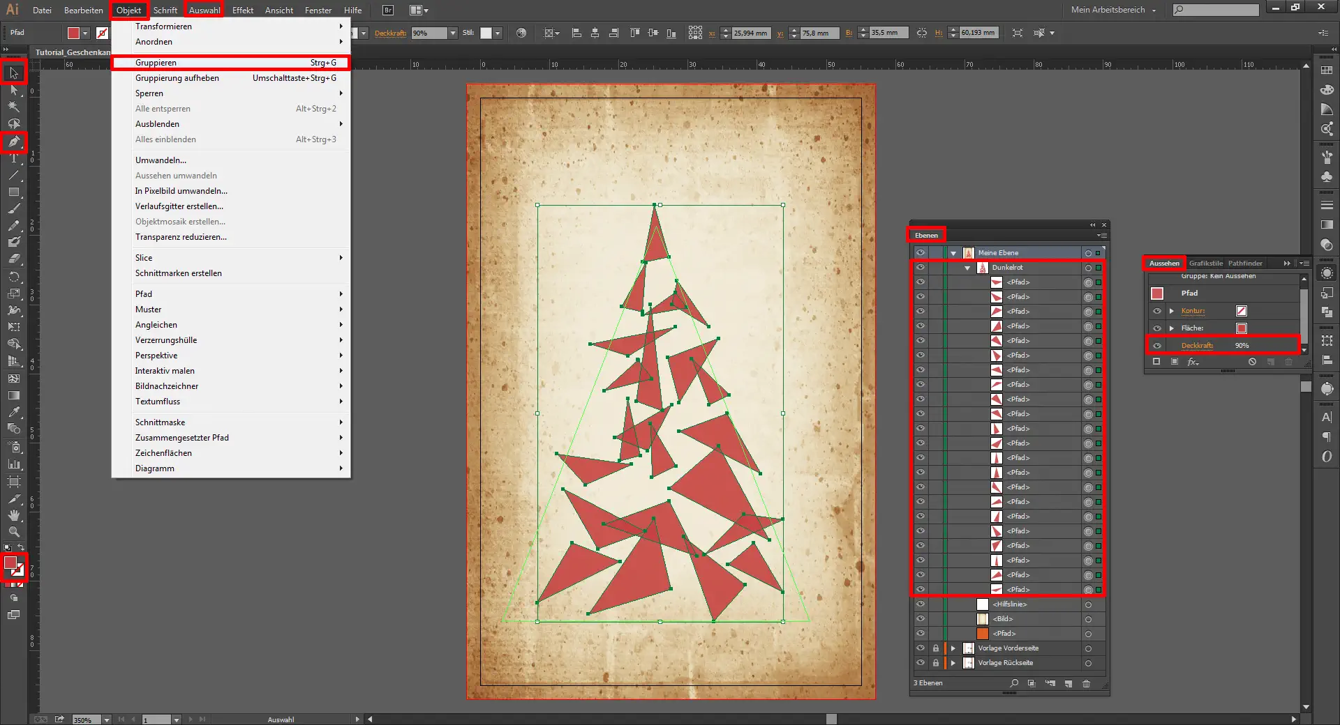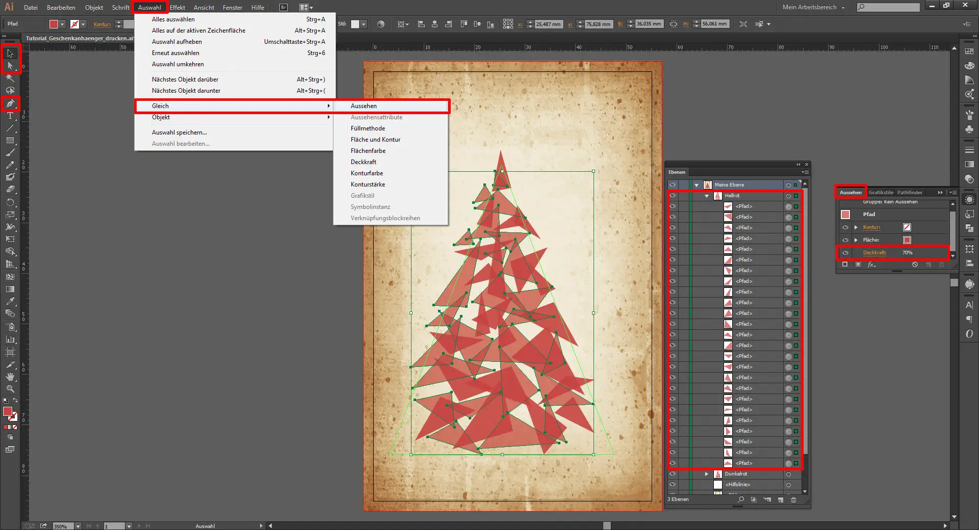 Genauso verfahrt ihr nun auch für die anderen Rechtecke. Auch diese erstellt ihr mit dem Zeichenstift-Werkzeug (P) mit der gleichen Farbe (#D13C3D). Allerdings senkt ihr hier die Deckkraft aller ausgewählten Dreiecke (Auswahl / Gleich / Aussehen) auf 70 %. Anschließend gruppiert ihr auch diese Dreiecke zur Gruppe „Hellrot“.