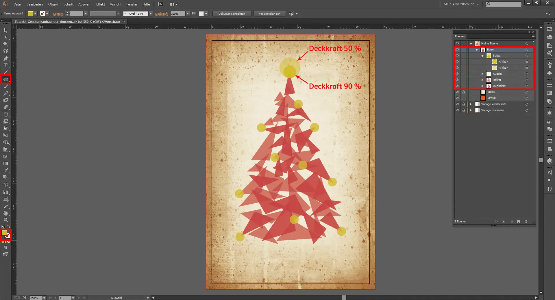 Das als Hilfslinie erstellte Dreieck könnt ihr nun schon wieder löschen. Dann verpasst ihr dem Baum mit dem Ellipsen-Werkzeug (L) und gedrückt gehaltener Umschalt-Taste noch ein paar gelbe Kugeln (#DCB719). Die Deckkraft aller Weihnachtsbaumkugeln auf diesem Geschenkanhänger senkt ihr auf 80 %. Auch diese Objekte gruppiert ihr anschließend wieder alle zu einer Gruppe „Kugeln“.