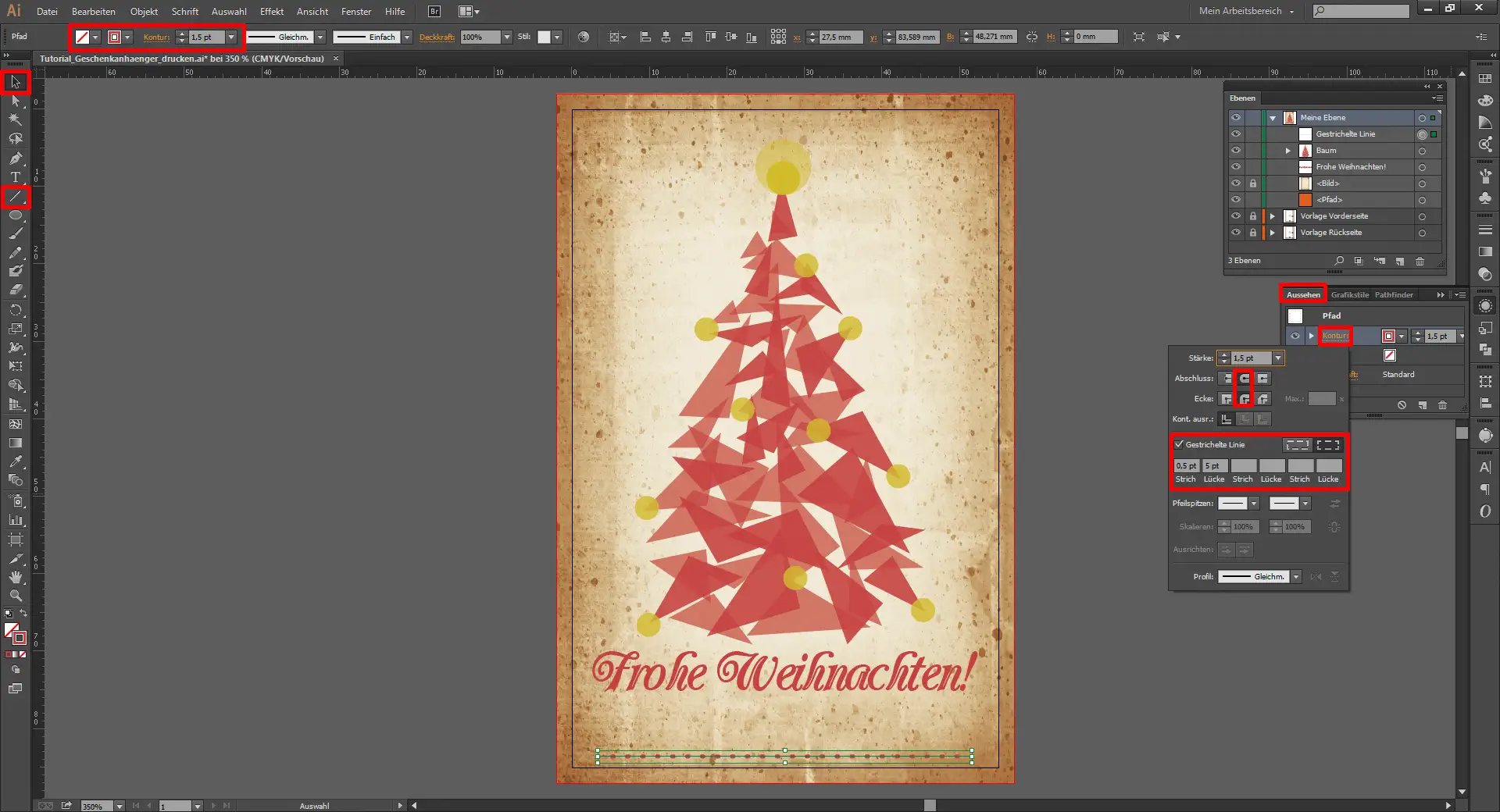 Ihr wollt natürlich nicht den Namen jedes einzelnen Glücklichen, der beschenkt wird, auf euren Geschenkanhänger drucken, sondern diesen dann zuhause ganz persönlich von Hand auf den Anhänger schreiben. Damit ihr trotzdem eine Linie zum Draufschreiben findet, müsst ihr mit dem Liniensegment-Werkzeug (Umschalt+:) eine Linie aufziehen. Diese erhält als Konturfarbe das schon mehrfach verwendete Rot (#D13C3D). Die Kontur ist 1,5 pt stark. Die gestrichelte Linie erstellt ihr, in dem ihr im Aussehen-Fenster auf die Schaltfläche „Kontur“ klickt und dort den Haken bei „Gestrichelte Linie“ setzt. Dann tragt ihr bei Strich 0,5 pt und bei Lücke 5 pt ein.