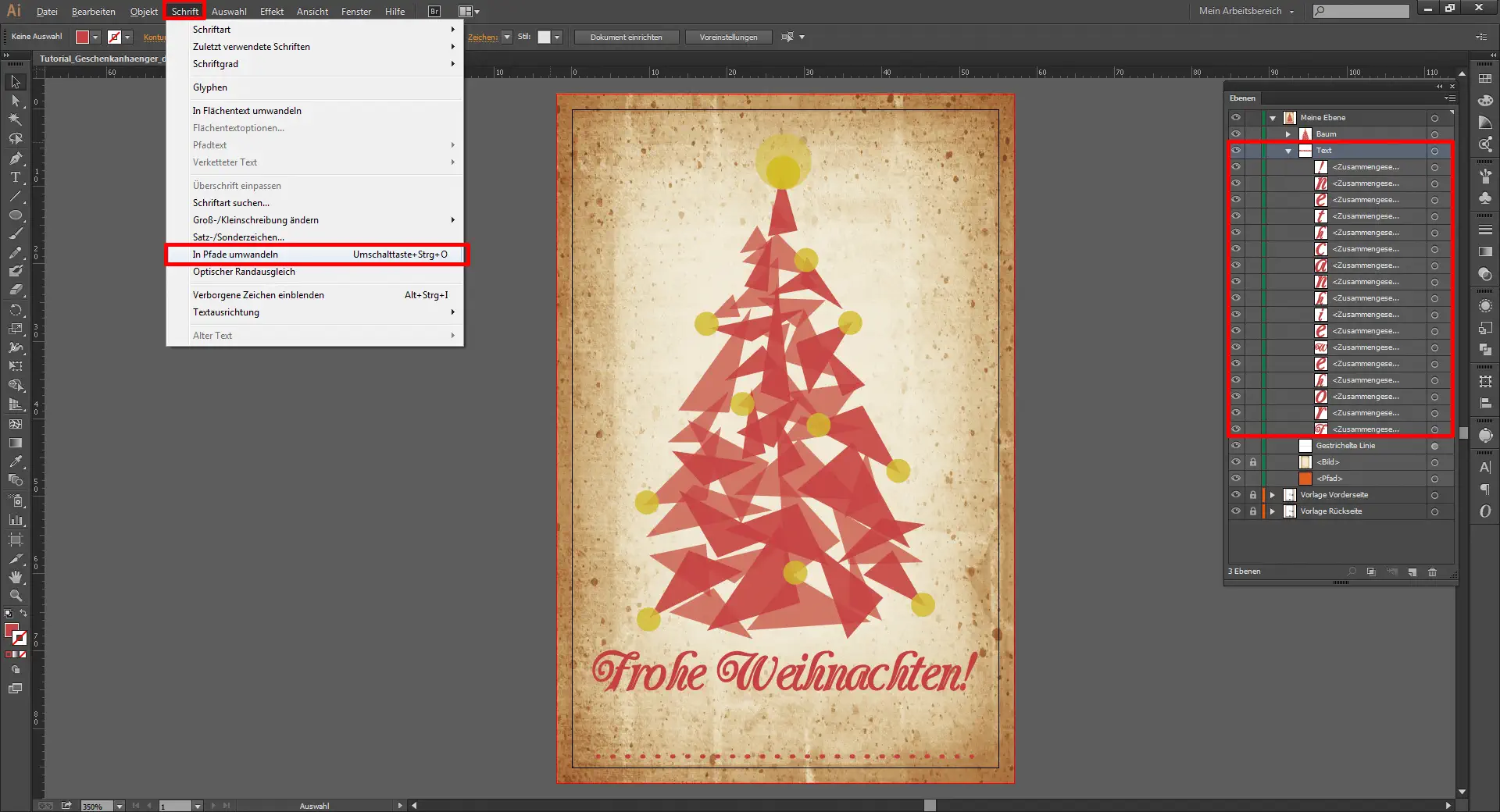 Leider lässt es die Lizenz der hier gewählten Schriftart nicht zu, dass sie in der PDF-Datei, die wir schließlich zum Drucken benötigen, eingebettet wird. Um den Text aber plattformübergreifend und ohne Darstellungsprobleme auch in das PDF zu exportieren, wandelt ihr den Text einfach in Pfade um. Kontrolliert aber vorher bitte noch einmal die Rechtschreibung, denn nach dem Umwandeln kann der Text nicht mehr mit dem Text-Werkzeug (T) editiert werden. Um die Schrift nun umzuwandeln, wählt ihr das entsprechende Textfeld aus und wandelt die Schrift über Schrift / In Pfade umwandeln (Shift + Strg + O) um. Damit gibt es dann später beim PDF-Export und beim Drucken keine Probleme mehr, denn damit wird jeder einzelne Buchstabe als separater Pfad abgespeichert.