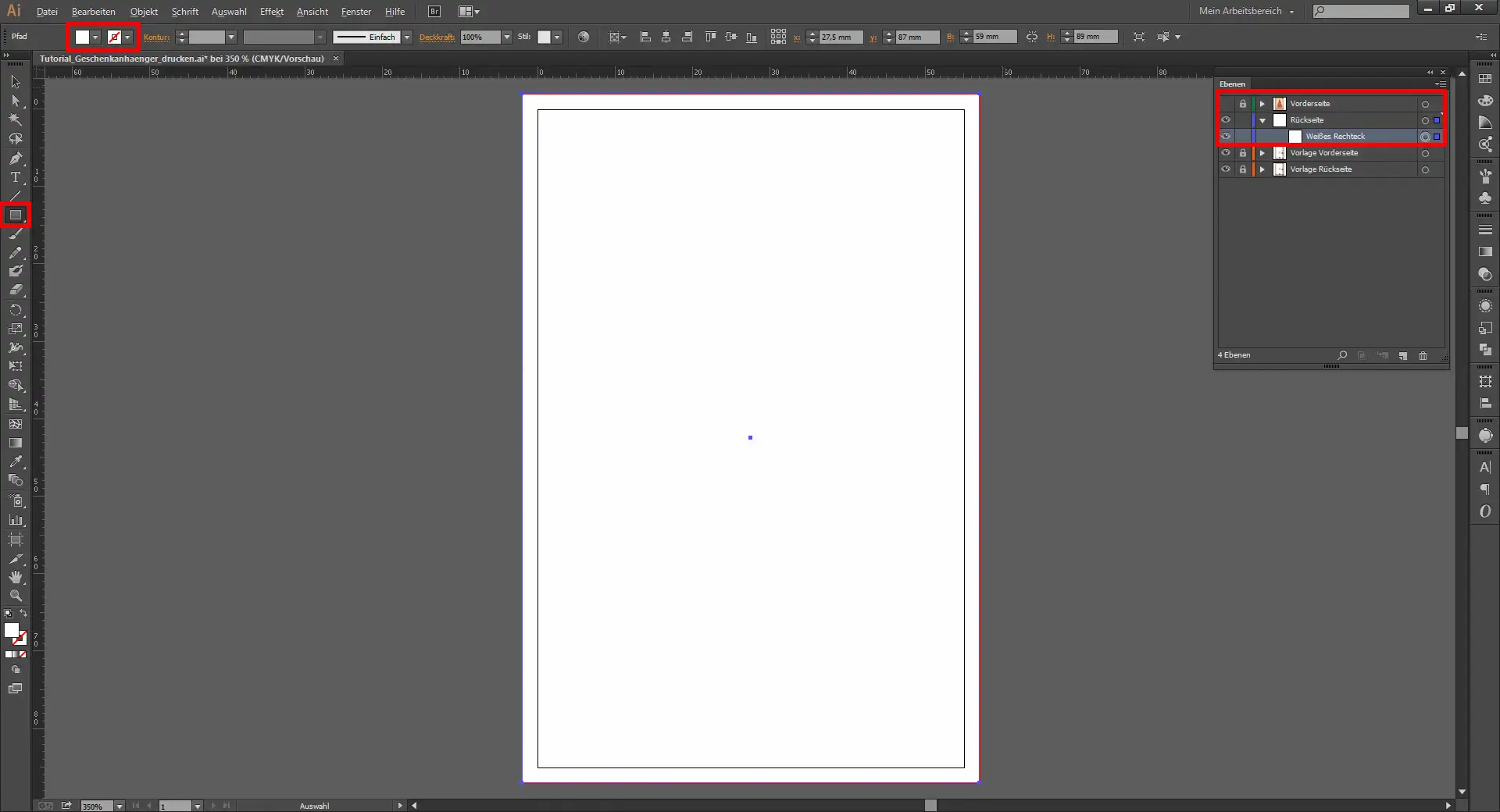 Ihr nennt nun noch die bislang bearbeitete Ebene in „Vorderseite“ um. Dann macht ihr diese Ebene unsichtbar, sperrt sie und erstellt euch über die Schaltfläche „Neue Ebene erstellen“ im Ebenen-Fenster eine neue Ebene „Rückseite“. Auf dieser neuen Ebene erstellt ihr euch nun mit dem Rechteck-Werkzeug (M) zunächst ein weißes Rechteck ohne Kontur über die gesamte Zeichenfläche.