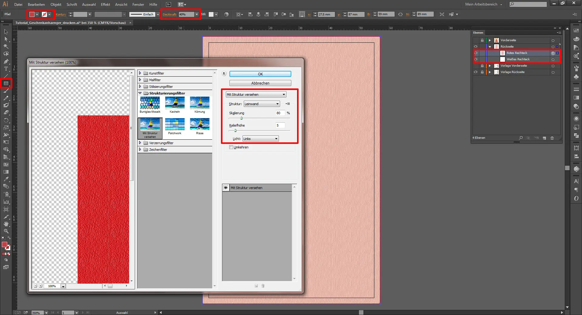 Darüber fügt ihr nun ein weiteres Rechteck ein. Dieses bekommt als Farbe das bekannte Rot (#D13C3D) und dann geht ihr mit diesem aktiven Rechteck auf Effekt / Strukturierungsfilter / Mit Struktur versehen. Dort wählt ihr als Struktur „Leinwand“ aus, skaliert diesen Effekt auf 80 % und gebt für die Reliefhöhe den Wert 5 ein. Das Licht kommt hierbei von links. Mit OK bestätigt ihr das Anwenden dieses Filters. Danach senkt ihr die Deckkraft dieser Ebene noch auf 40 %.