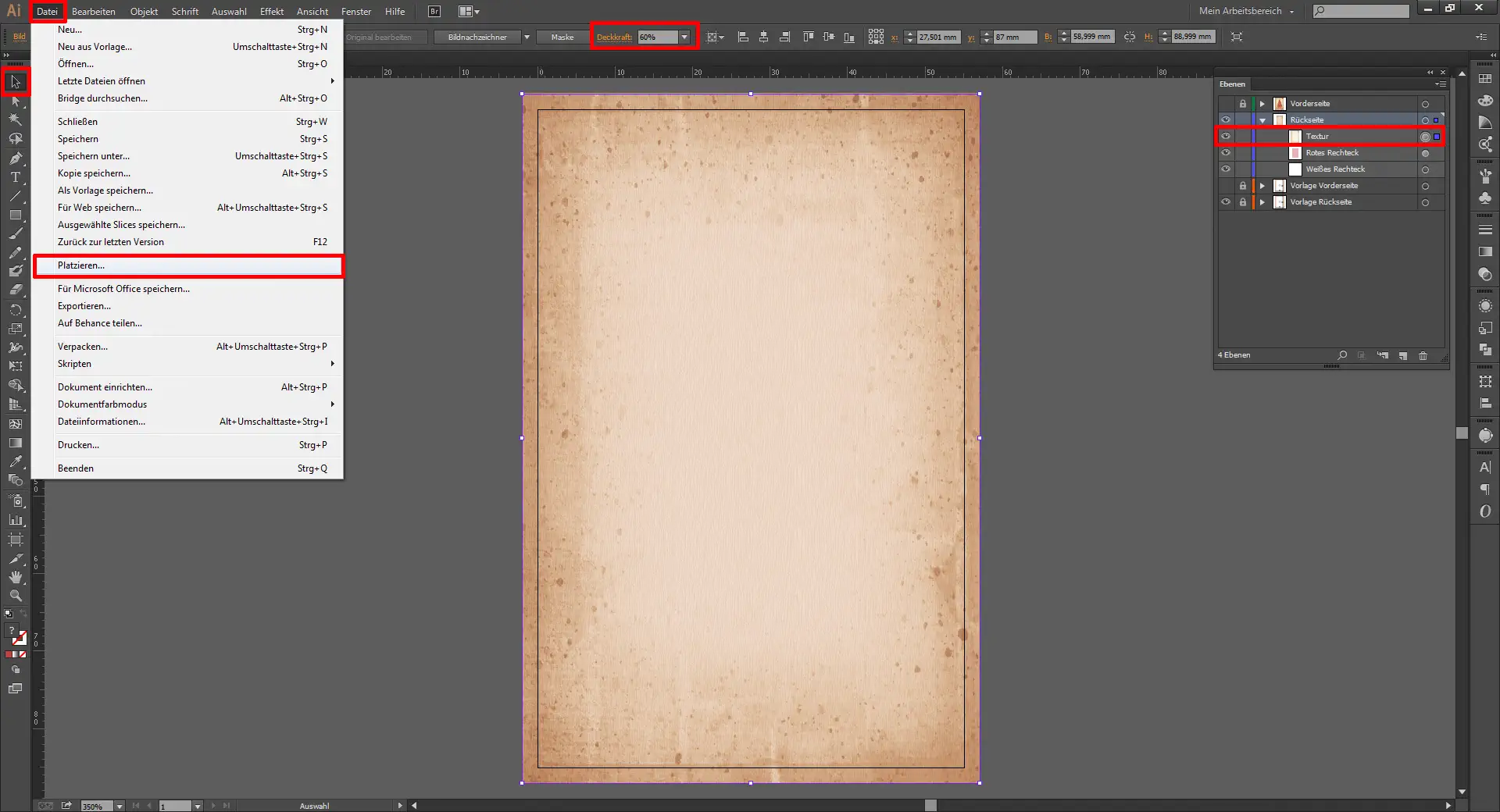 Über dieses Rechteck platziert ihr nun wieder die schon aus Step 1 bekannte Papier-Textur (Datei / Platzieren). Die Deckkraft senkt ihr hier auf 60 %.