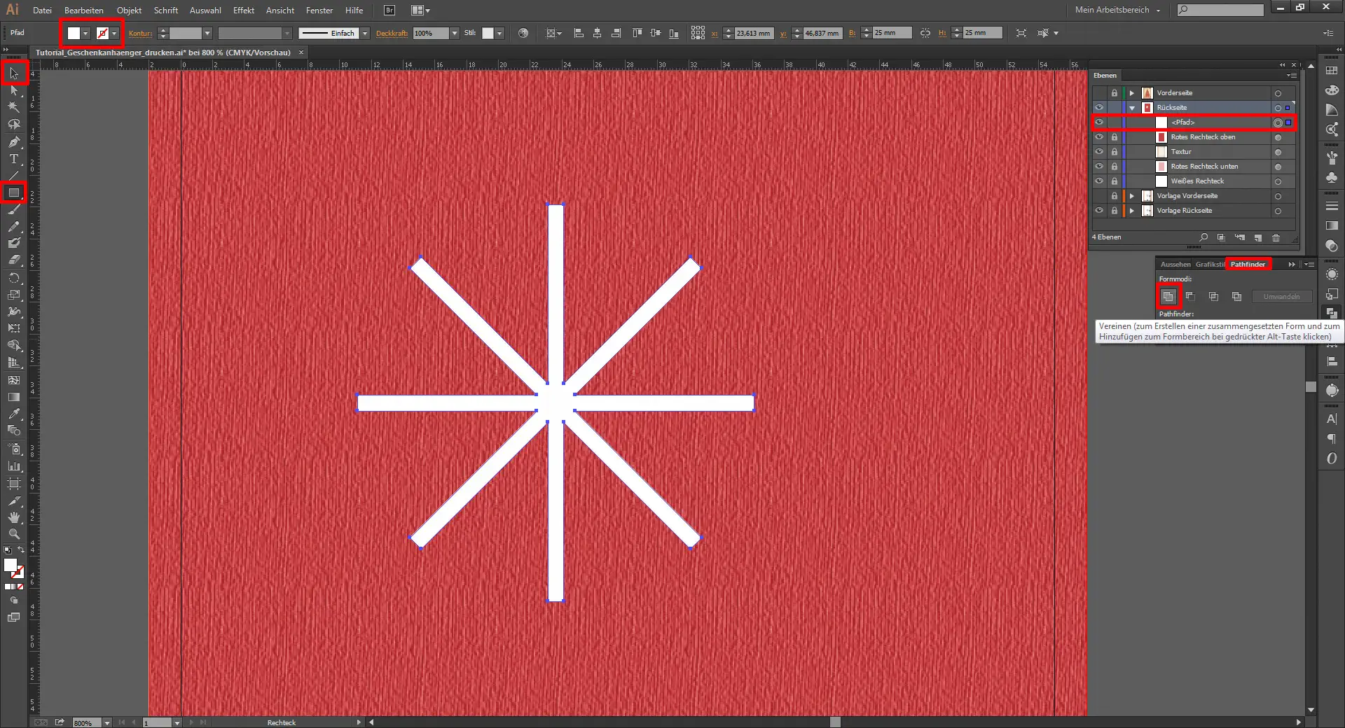 Jetzt macht ihr euch an das Erstellen der stilisierten Schneesterne. Dazu zieht ihr euch mit dem Rechteck-Werkzeug (M) ein 25 x 1 mm großes, weißes Rechteck auf. Dieses Rechteck kopiert ihr über den Shortcut Strg + C und fügt die Kopie mit Strg + F vor dem Original wieder ein. Die Kopie dreht ihr um 90°. Dann markiert ihr beide Rechtecke und geht im Pathfinder-Fenster auf die Schaltfläche „Vereinen“. Dann kopiert ihr den entstandenen Pfad erneut (Strg + C) und fügt ihn davor wieder ein (Strg + F). Auch diese Kopie dreht ihr. Dieses Mal allerdings nur um 45°. Nun markiert ihr wieder die zwei Objekte und vereint sie, so dass nun folgender Pfad entstanden ist: