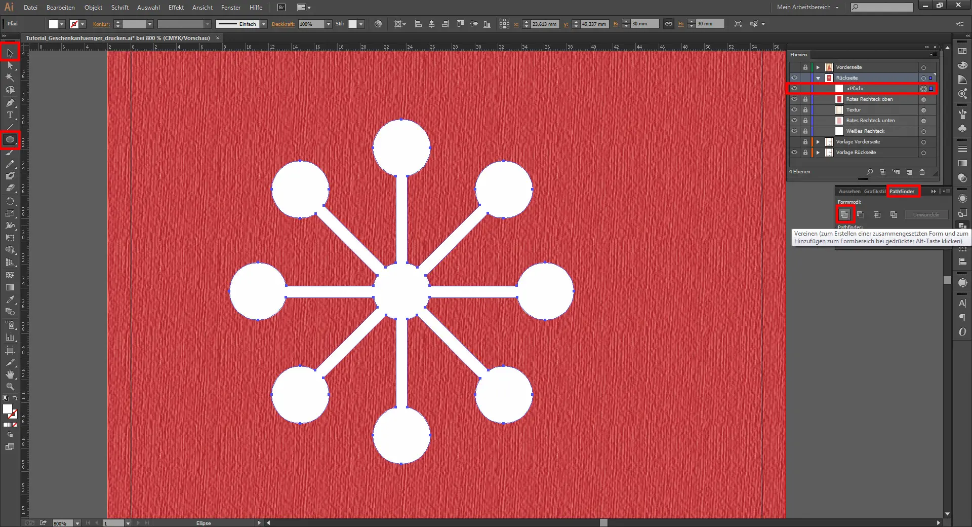 Mit dem Ellipsen-Werkzeug (L) zieht ihr euch nun einen Kreis mit einem Durchmesser von 5 mm auf. Diesen platziert ihr genau über dem Schnittpunkt der Linien. Anschließend zieht ihr euch weitere Kreise mit 5 mm Durchmesser auf und platziert diese wie hier zu sehen. Zum Schluss markiert ihr all diese Kreise und den im vorherigen Step erstellten Pfad und vereint alle Elemente zu einem Pfad.
