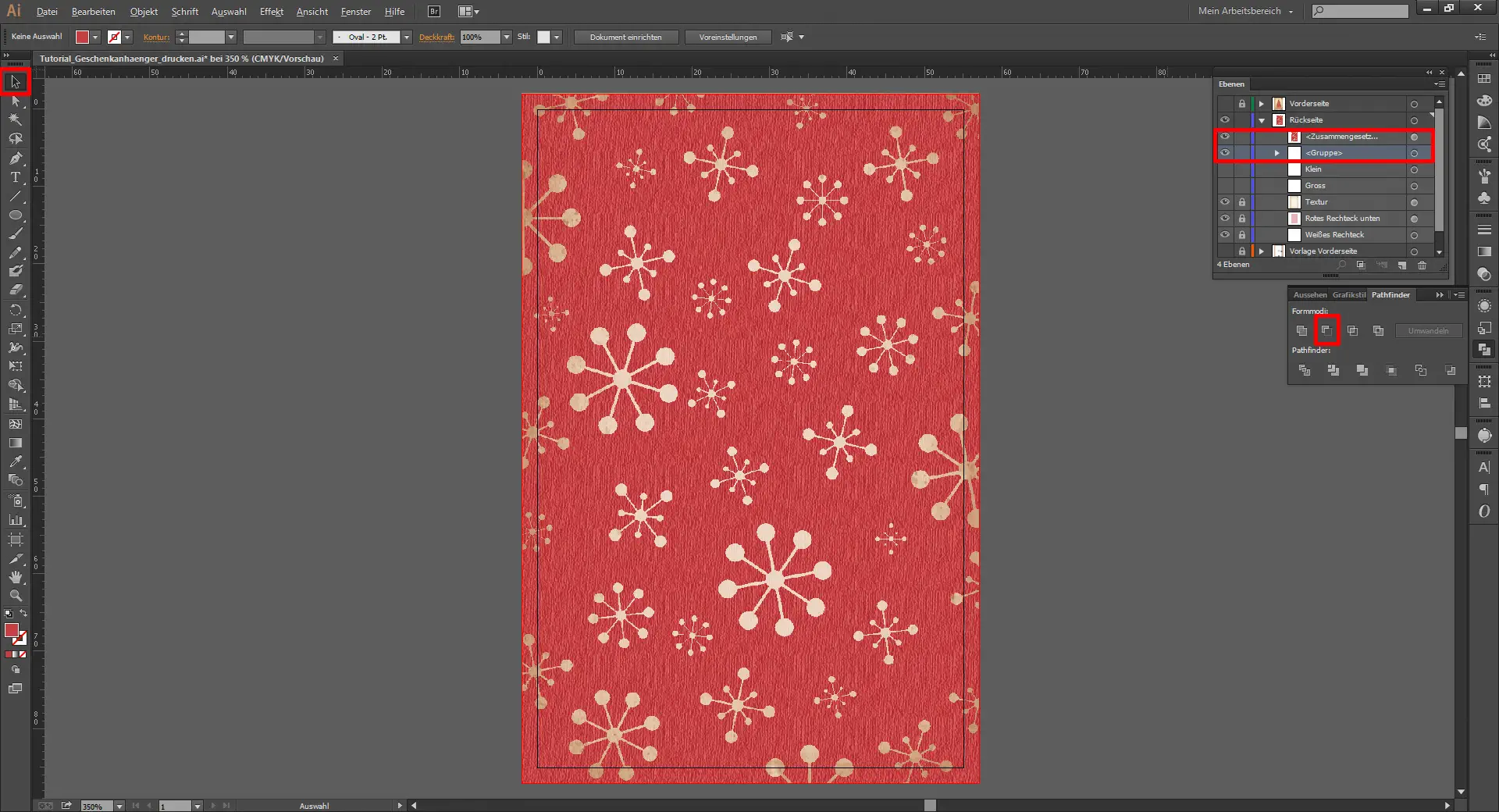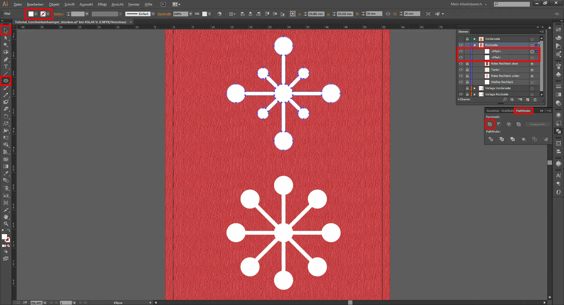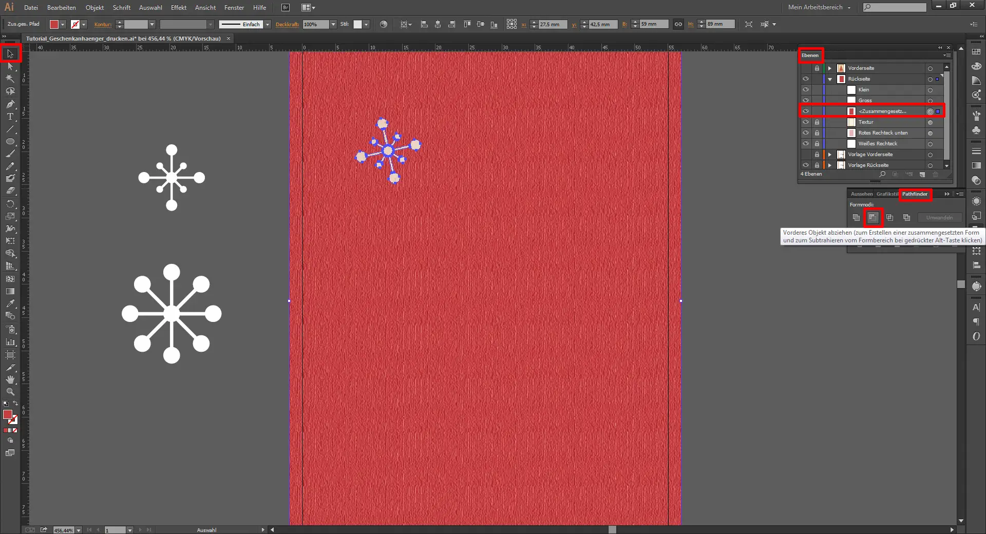 Nun verkleinert ihr den Pfad mit den kleinen Kreisen auf 10 x 10 mm bzw. den mit den großen Kreisen auf 15 x 15 mm. Dann schiebt ihr beide Pfade von der Zeichenfläche herunter und erstellt zunächst von dem kleineren Pfad eine Kopie (Strg + C & Strg + F). Dann schiebt ihr diese Kopie wieder auf die rote Fläche und dreht sie ein wenig. Nun schiebt ihr diese Kopie im Ebenen-Fenster über das oberste, rote Rechteck, markiert mit gedrückt gehaltener Umschalt-Taste den Stern und das Rechteck und geht im Pathfinder-Fenster auf „Vorderes Objekt abziehen“.