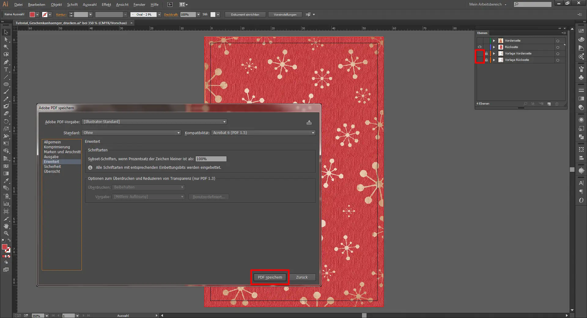 Nun braucht ihr nur noch die beiden Vorlagen-Ebenen unsichtbar zu machen und alles als PDF-Datei abzuspeichern und schon könnt ihr die Geschenkanhänger für die ganze Familie bei uns als Visitenkarte drucken lassen. Falls gewünscht könnt, ihr die Karten zu Hause dann mit Hilfe eines Lochers stanzen und mit einem Faden an die Geschenke anbringen.
