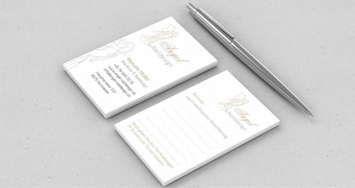 Jeder kennt sie – die kleinen Terminkarten, die es in der Arztpraxis, im Nagelstudio oder bei der Fußpflege gibt. Diese Karten sollten zum Corporate Design eurer Praxis oder eures Salons einfach mit dazugehören und sich harmonisch in eure Designlinie einfügen. So sind diese praktischen Terminzettel eine nützliche Ergänzung zur üblichen Visitenkarte und somit ein wirkungsvolles Kommunikationsmittel. Das macht diese kleinen Kärtchen nicht nur zum Erinnerungshelferlein, sondern auch zu einem starken Werbeinstrument. Eine ansehnlich gestaltete Terminkarte verschwindet nicht einfach in der Geldbörse oder der Jackentasche, sondern wird zuhause an der Pinnwand oder den Kalender geheftet und so von der ganzen Familie, von den Freunden und den Verwandten wahrgenommen.
