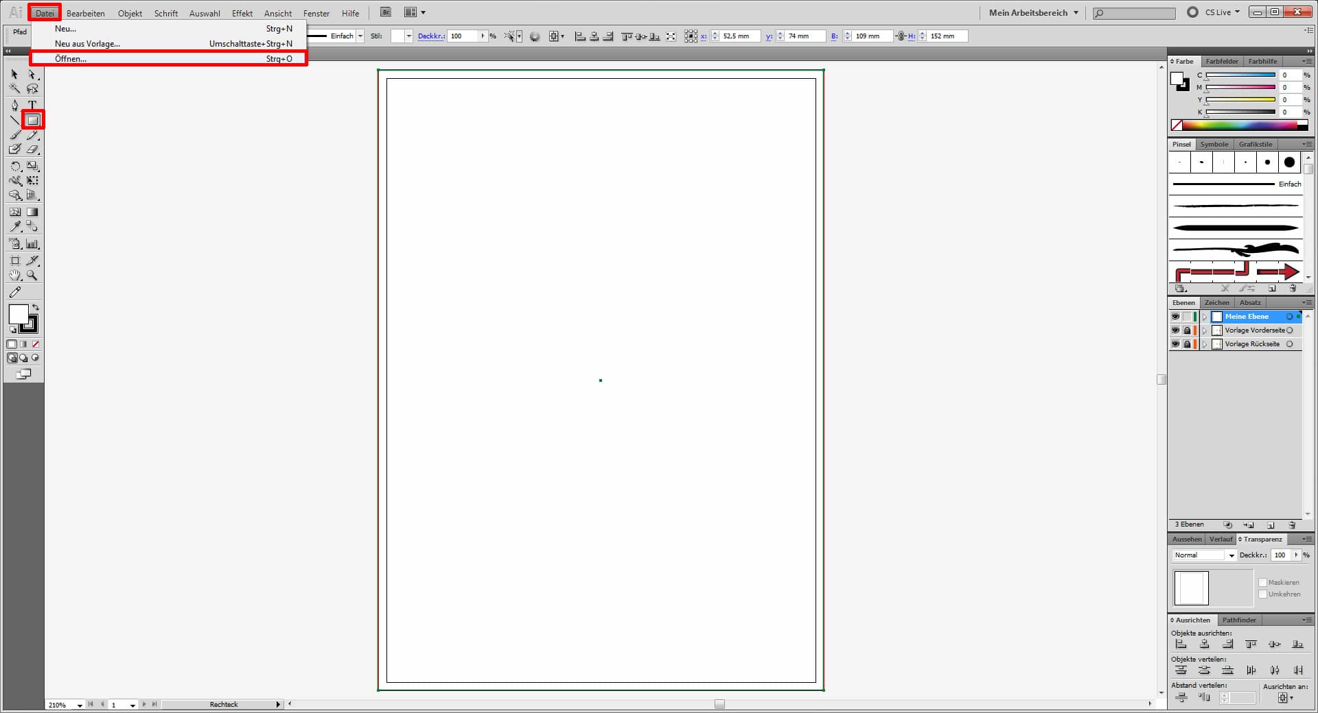 Ihr beginnt zunächst mit der Hintergrundgestaltung eurer Grußkarte für Ostern in Adobe Illustrator. Eine passende Vorlage hierzu findet ihr natürlich in unserem Druckvorlagen-Generator. Vielleicht ist euch ja bereits aufgefallen, dass wir unsere Druckvorlagenseite für euch optimiert haben, damit ihr noch einfacher an die passenden Vorlage gelangt. Als Produkt wählt ihr einfach Karten / Grußkarten aus. Beim Endformat könnt ihr das DIN-A6-Hochformat auswählen und da eure Karte natürlich Vorder- und Rückseite haben soll, müsst ihr 2 Seiten angeben. Darunter bekommt ihr dann gleich die passenden Druckvorlagen in allen denkbaren Dateiformaten zum Download angeboten. Wählt hier zunächst eine Datei für Adobe Illustrator aus. Diese öffnet ihr in Illustrator über den Menüpunkt Datei / Öffnen (Strg+O). Mit dem Rechteck-Werkzeug (M) zieht ihr anschließend über die gesamte Zeichenfläche, also bis an die äußeren Ränder des orangenen Bereiches ein Rechteck auf.