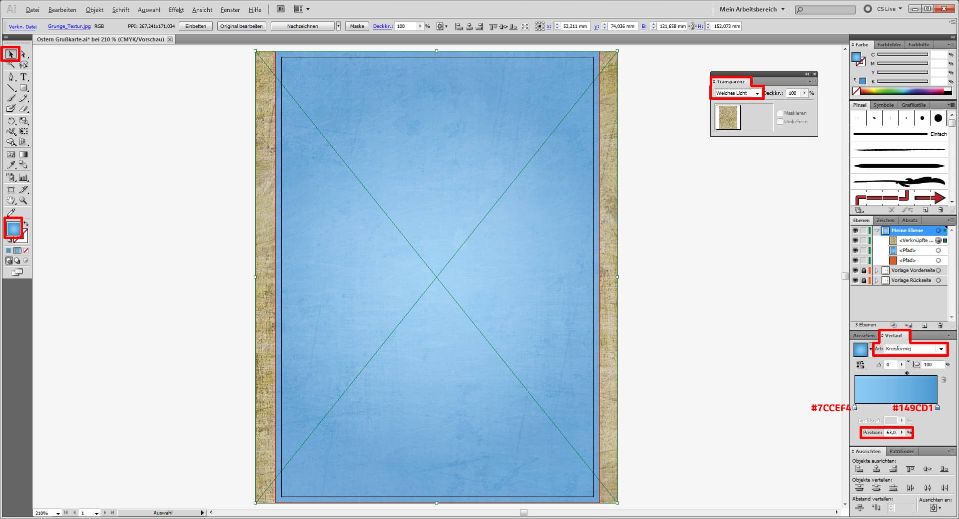 Für dieses Rechteck müsst ihr nun im Verlaufsfenster einen radialen Verlauf definieren. Dieser läuft von Hellblau (#7CCEF4) zu Dunkelblau (#149CD1). Dann verschiebt ihr noch die Position auf 63 %. Ladet euch nun eine kostenlose Textur herunter und fügt diese über Datei / Platzieren in euer Dokument über dem Rechteck ein. Zum Skalieren der Textur könnt ihr das Auswahl-Werkzeug (V) verwenden. Im Transparenz-Fenster ändert ihr noch den Modus der Textur in Weiches Licht um.