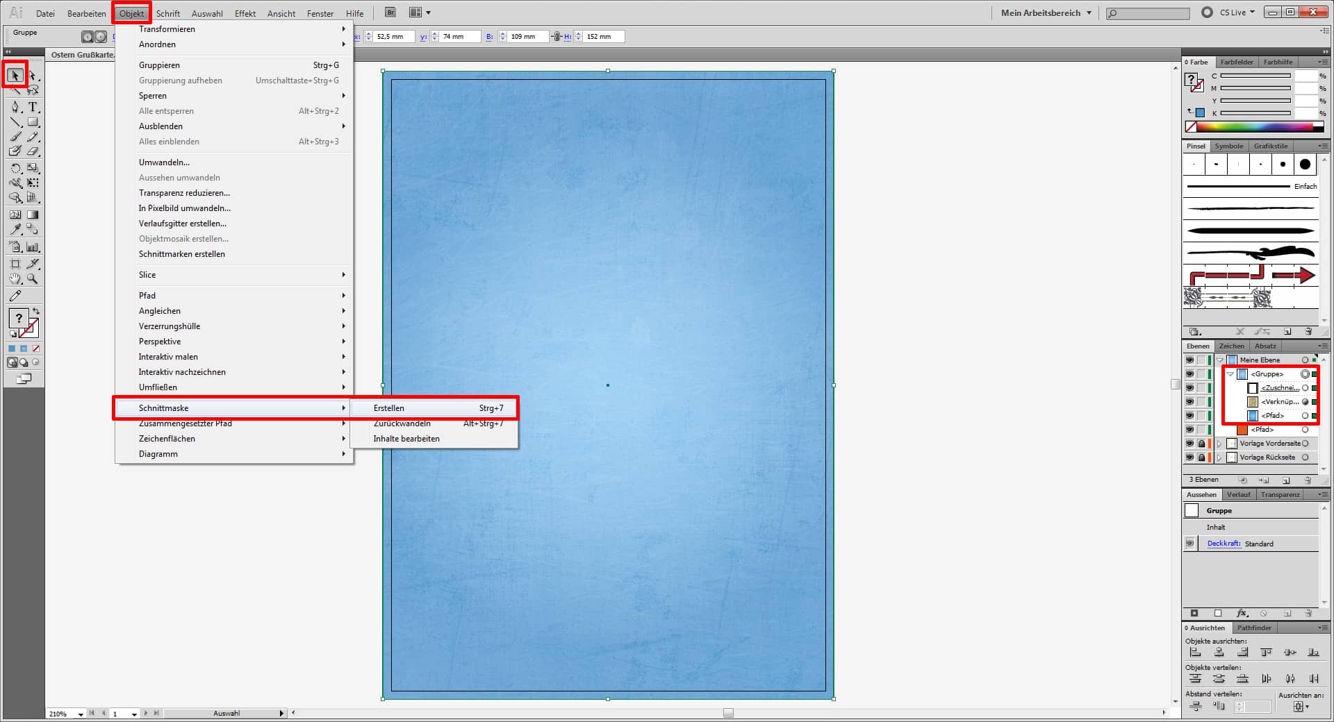 Damit die Textur nun nicht an den Rändern übersteht, müsst ihr sie mit Hilfe einer Schnittmaske auf die Zeichenfläche begrenzen. Dazu dupliziert ihr euch einfach das Rechteck mit dem Verlauf (Strg+C), denn das hat ja schon die richtigen Abmaße und dann fügt ihr die Kopie davor wieder ein (Strg+F). Nun schiebt ihr die Kopie im Ebenenfenster über die Textur, markiert mit gedrückt gehaltener Umschalt-Taste und Klick darauf alle drei Ebenen und geht auf Objekt / Schnittmaske / Erstellen. Das Ergebnis ist eine schön freigestellte Rechteckfläche.