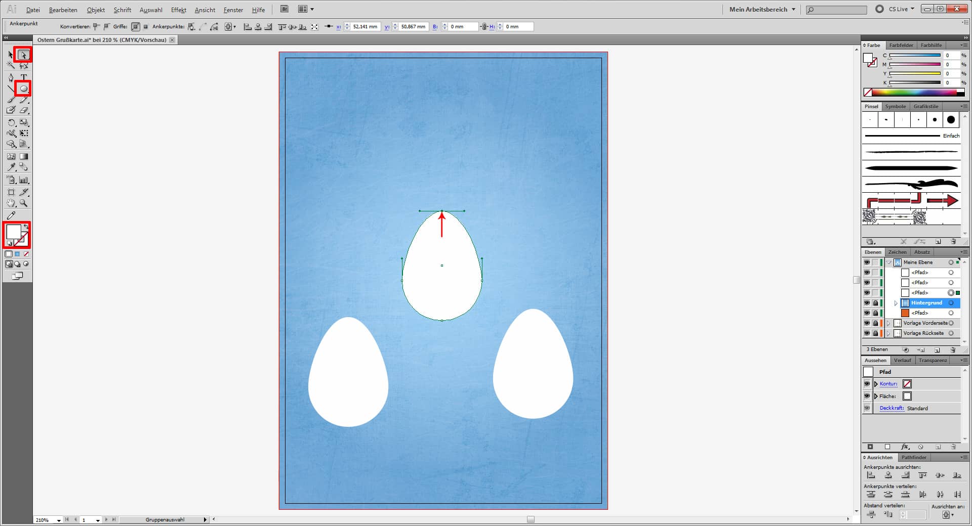 Jetzt ist auch schon das erste Ei an der Reihe. Mit dem Ellipsen-Werkzeug (L) und gedrückt gehaltener Alt- und Umschalt-Taste zieht ihr euch einen Kreis auf (weiße Fläche / keine Kontur). Wählt anschließend mit dem Direktauswahl-Werkzeug (A) den obersten Ankerpunkt an und verschiebt diesen mit gedrückt gehaltener Umschalt-Taste nach oben, so dass aus dem Kreis ein Ei wird. Dieses Ei dupliziert ihr nun zwei Mal (Strg+C / Strg+F).