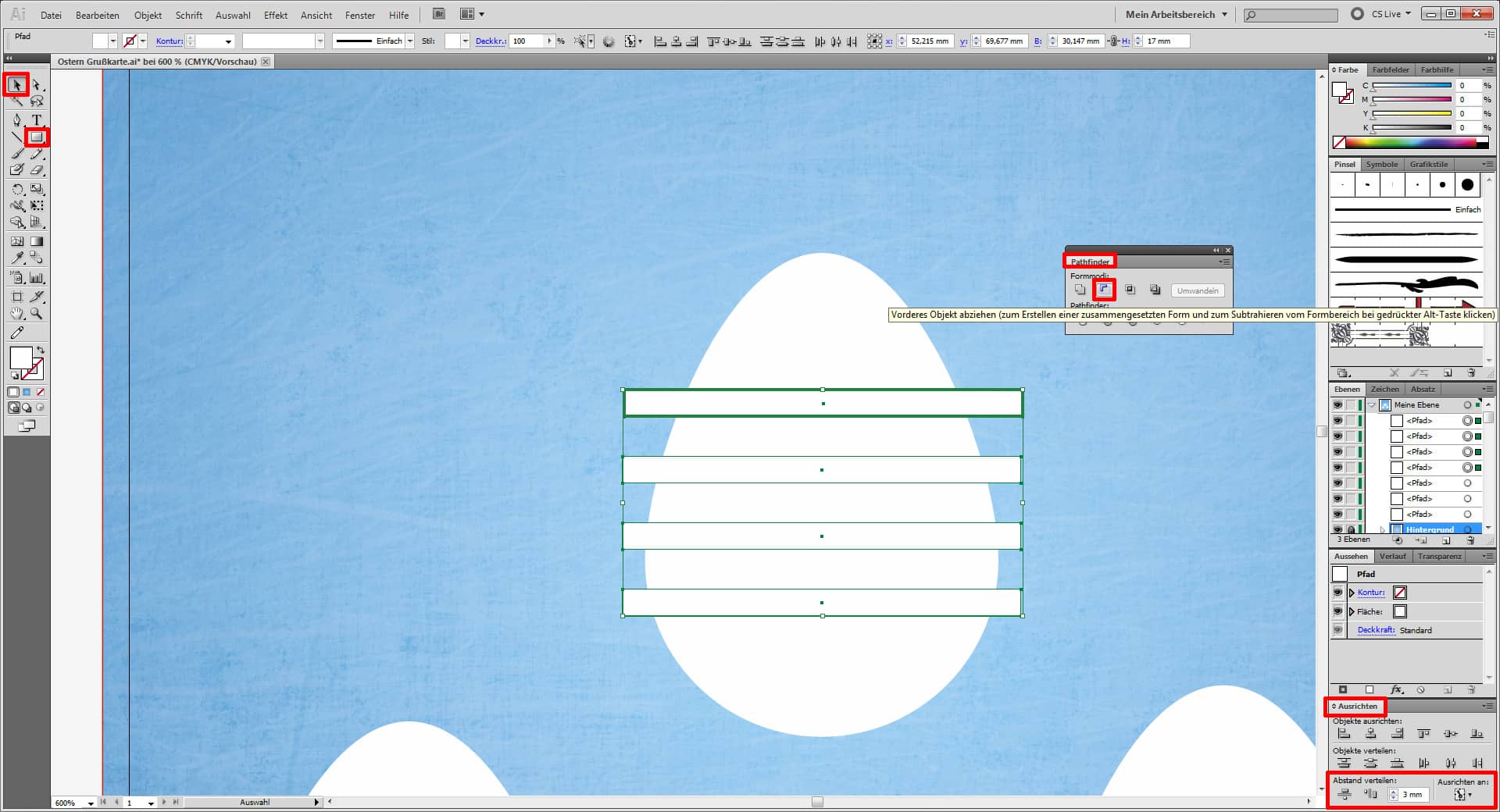 Mit dem Rechteck-Werkzeug (M) zieht ihr euch jetzt vier, etwa gleich große Rechtecke (30 x 2 mm) auf. Diese markiert ihr alle mit dem Auswahl-Werkzeug (M). Im Ausrichten-Fenster wählt ihr die Option An Basisobjekt ausrichten aus. Dann legt ihr mit Klick darauf das oberste Rechteck als Basisobjekt fest (das erkennt ihr dann an der etwas dickeren Umrandung) und gebt beim Abstand 3 mm ein. Nun geht ihr auf die Schaltfläche Vertikal verteilen: Abstand. Schon haben alle vier Rechtecke den gleichen Abstand von 3 mm voneinander. Markiert im Anschluss die vier Rechtecke sowie das Ei und geht im Pathfinder-Fenster auf die Schaltfläche Vorderes Objekt abziehen. Damit habt ihr das erste Ei bereits fertig.