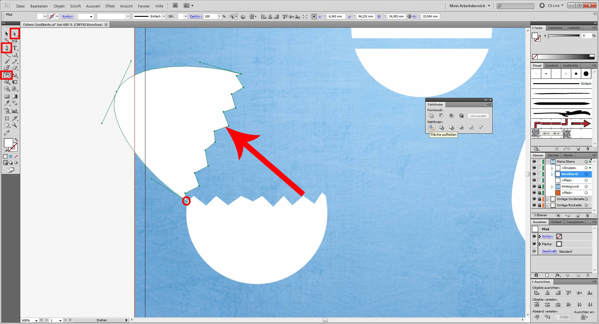 Mit dem Zeichenstift-Werkzeug (P) zeichnet ihr nun über dem zweiten Ei eine gezackte Linie, an der euer Ei gleich „aufgebrochen“ wird. Die Linie hat keine Flächenfarbe und auch die Farbe der Kontur spielt keine Rolle, da euch diese Linie ja gleich nur als eine Art Hilfslinie dienen wird. Ihr markiert nun wieder den Pfad und das Ei und geht im Pathfinder-Fenster auf Fläche aufteilen. Schon habt ihr zwei Eihälften. Die Obere wählt ihr nun mit dem Direktauswahl-Werkzeug (A) aus und dreht diese mit dem Drehen-Werkzeug (R). Den Rotationspunkt, um den ihr die obere Hälfte drehen wollt, zieht ihr auf die linke Seite der Ei-Hälfte (hier mit dem roten Kreis markiert).