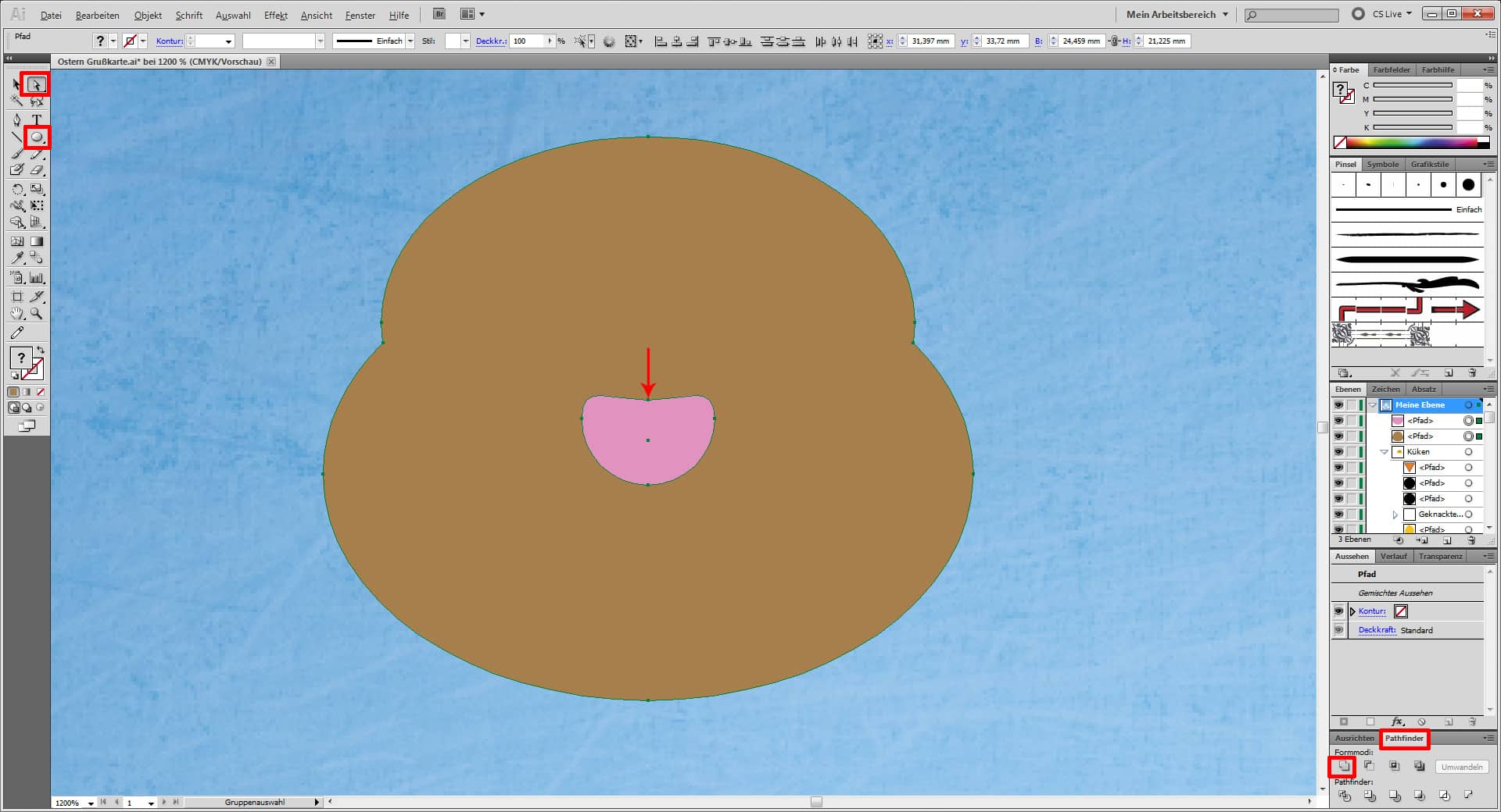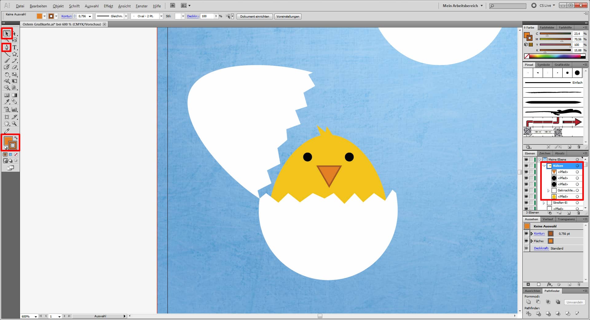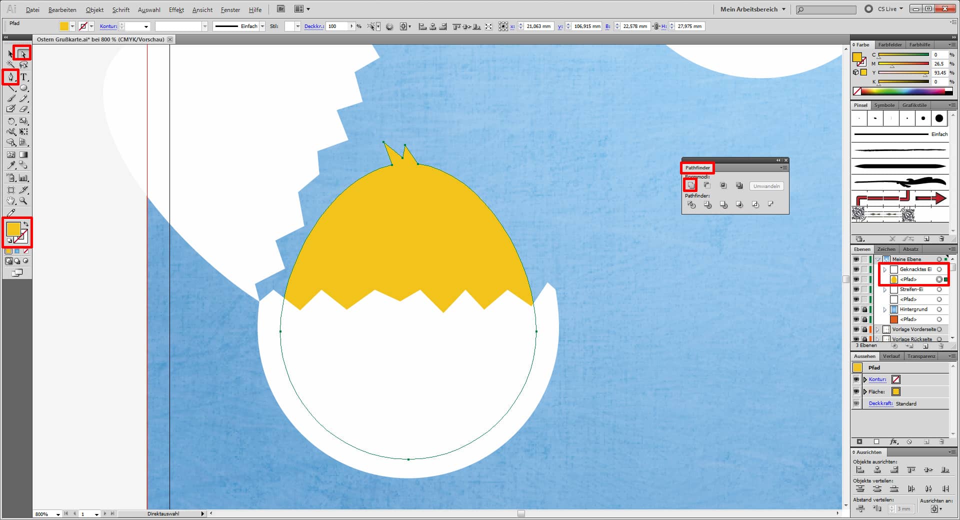 Ihr erstellt euch wieder ein etwas kleineres Ei, das gleich euer Küken formen wird, denn Küken gehören ja schließlich auf eine Ostergrußkarte. Die Farbe des Kükens ist natürlich gelb (#FFC200). Mit dem Zeichenstift-Werkzeug (P) zieht ihr noch ein paar Federn auf dem Kopf des Kükens auf. Den Pfad und das Ei vereinigt ihr im Pathfinder-Fenster mit dem Befehl Vereinen.