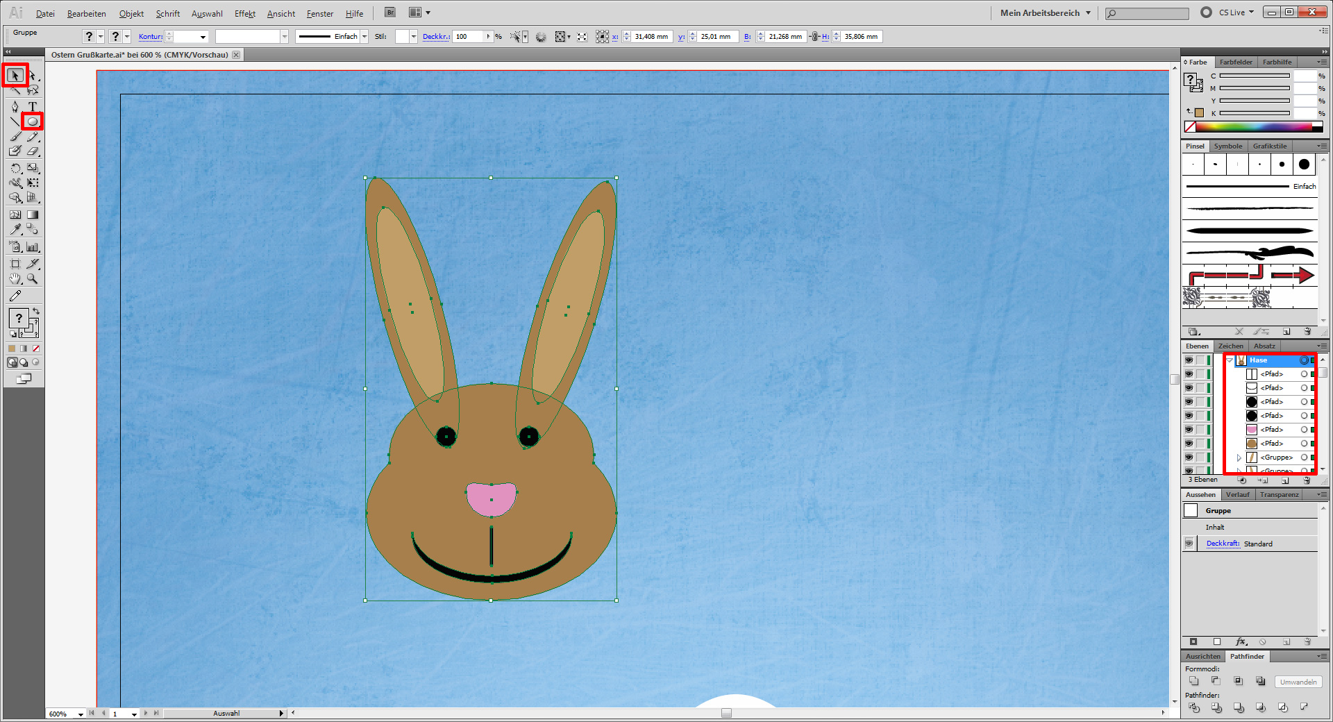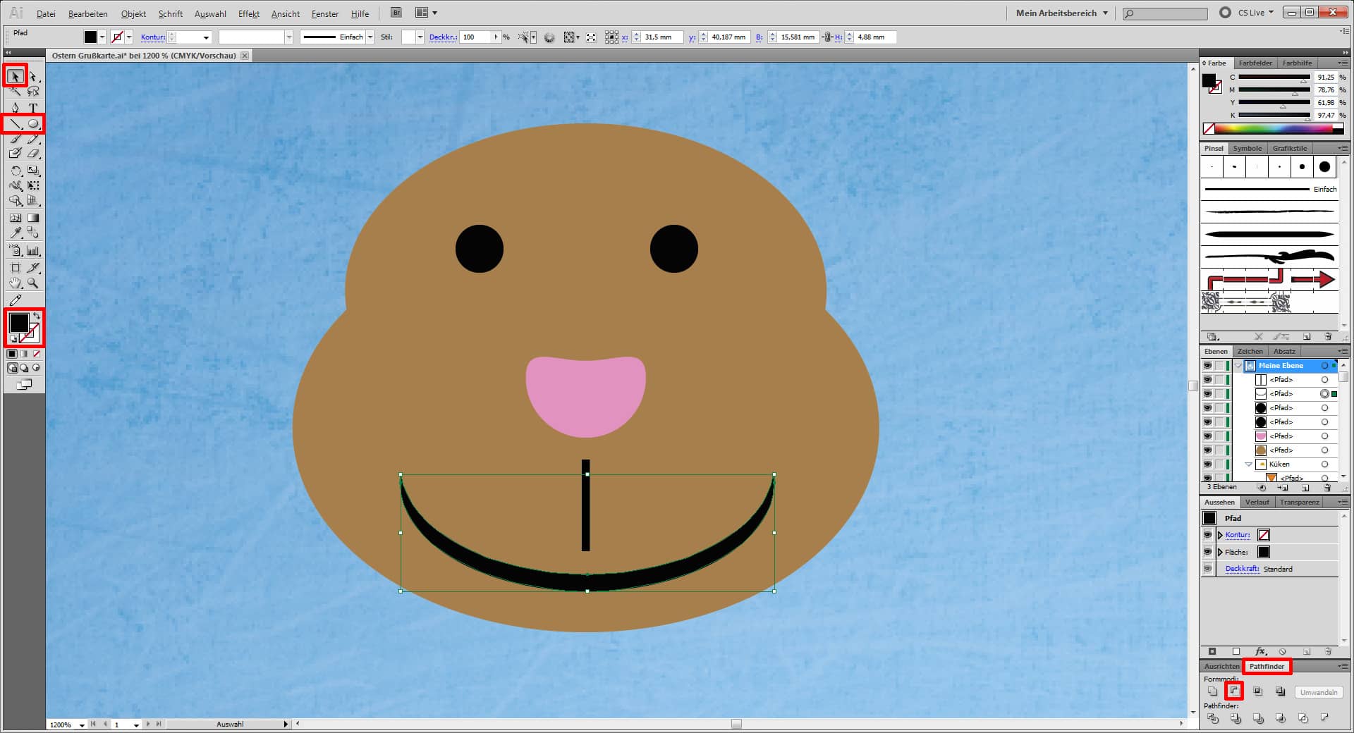 Mit dem Ellipsen-Werkzeug (L) formt ihr dem Hasen wieder zwei schwarze Augen und mithilfe des Liniensegment-Werkzeuges (Umschalt+:) formt ihr den ersten Teil unter der Nase nach. Dann zieht ihr zwei Ellipsen auf, legt diese etwas versetzt übereinander, markiert beide Objekte und geht im Pathfinder-Fenster auf Vorderes Objekt abziehen. So ist dann auch schon gleich euer Hase für eure Ostergrüße fast fertig.