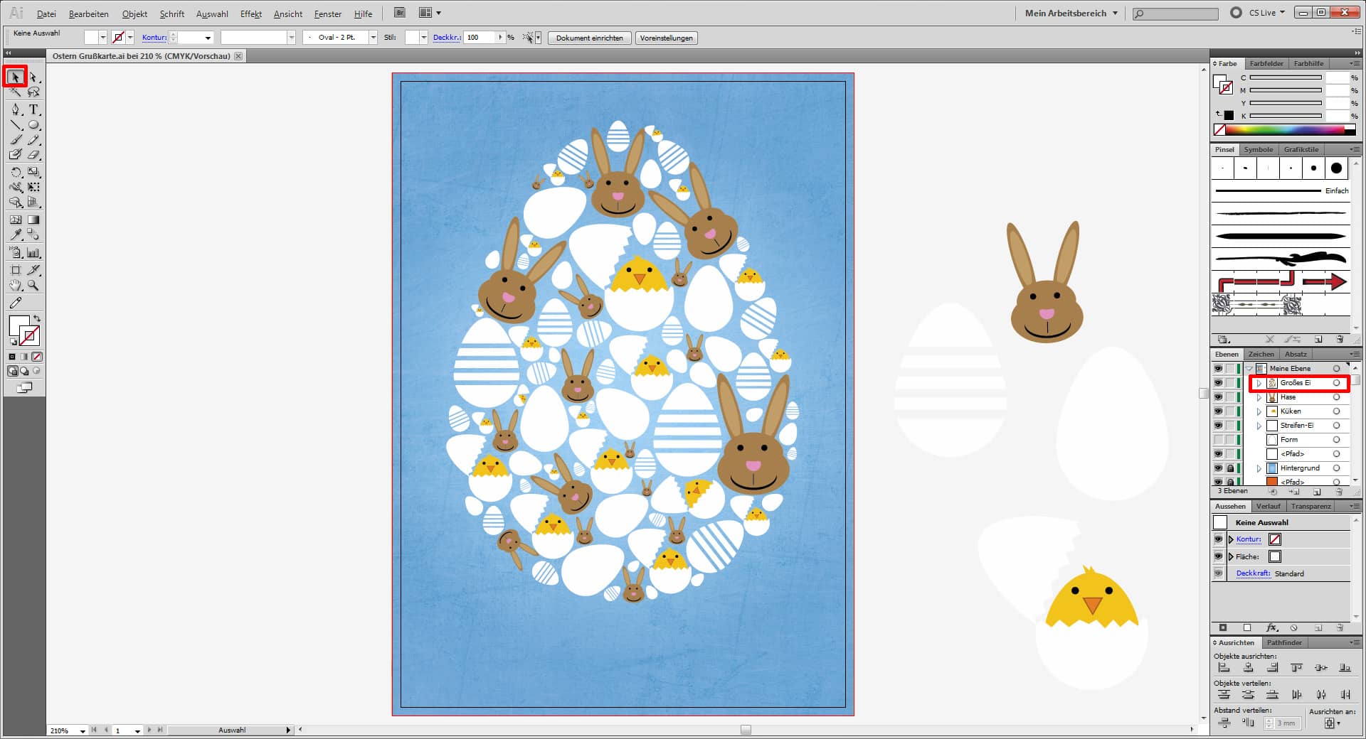 Jetzt kommt ein bisschen Fleißarbeit auf dem Weg zur hübschen Ostergrußkarte auf euch zu. Dupliziert das letzte, noch unbearbeitete Ei und zieht es euch auf eine ansprechende Größe zurecht. Diese, jetzt mit schwarzer Kontur und ohne Flächenfarbe versehene Kopie bildet dann quasi den Rahmen für alle anderen Elemente, die ihr nun durch mehrmaliges Kopieren, Drehen und Skalieren in Ei-Form anordnet. Wenn euer Ei dann vollständig ausgefüllt ist, könnt ihr die äußere Form wieder löschen und anschließend alle Objekte innerhalb dieser Ei-Form gruppieren. Dann ist auch schon der Großteil der Arbeit geschafft.