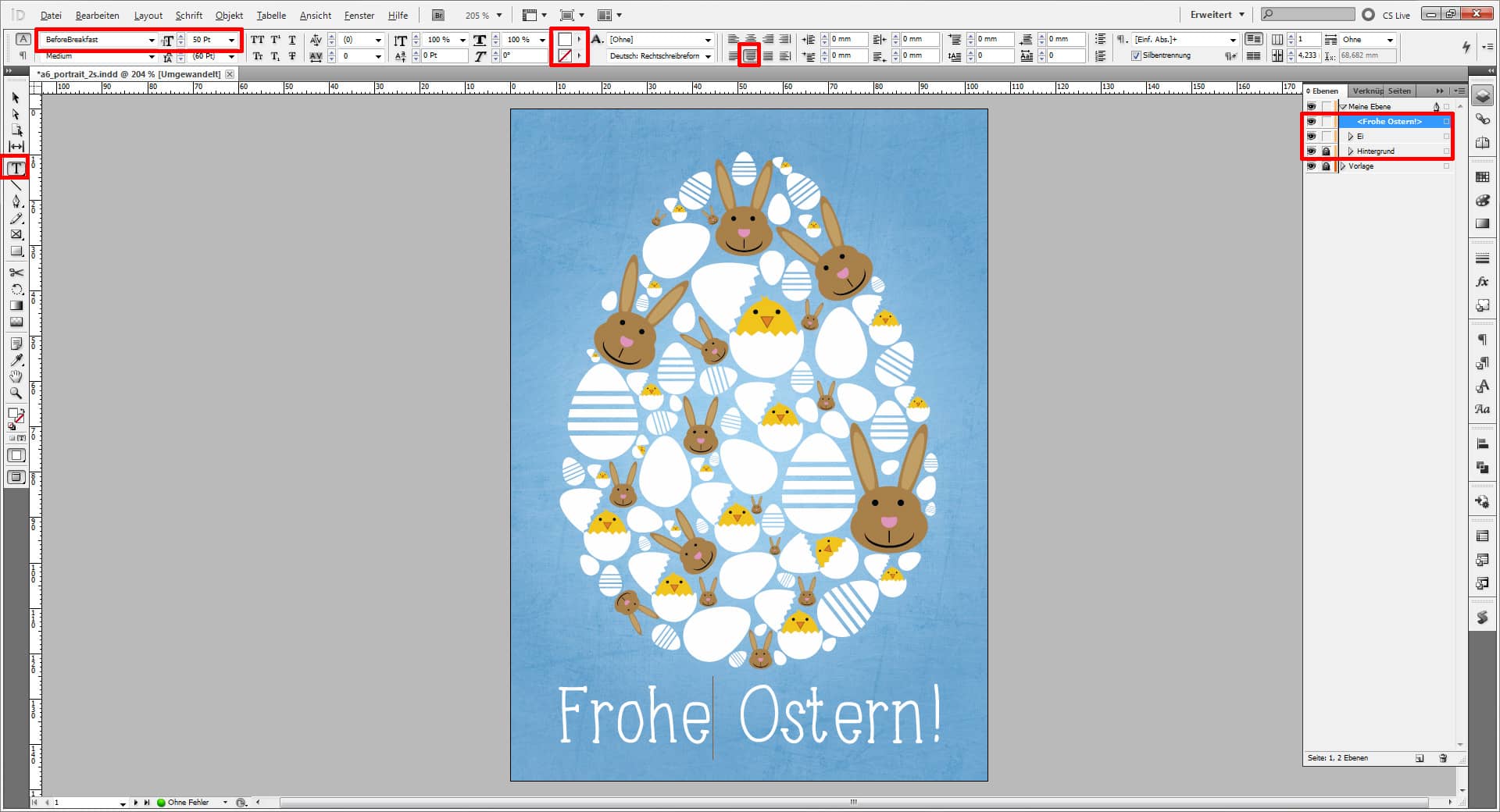 Ihr könnt nun die Gestaltung weiter in Illustrator fortführen oder aber zu InDesign wechseln. Öffnet dort ebenfalls die entsprechende Druckvorlage, kopiert Ei und Hintergrund aus Illustrator (Strg+C) und fügt alle Elemente dann in InDesign mit Strg+V wieder ein. Achtet bitte darauf, dass ihr auf Seite 1 arbeitet und dass ihr die Objekte nicht auf die gesperrte Vorlagen-Ebene einfügt. Mit dem Textwerkzeug (T) schreibt ihr anschließend eure Osterbotschaft unter das Ei. Als Schriftart für diese Karte habe ich die Before Breakfast gewählt.